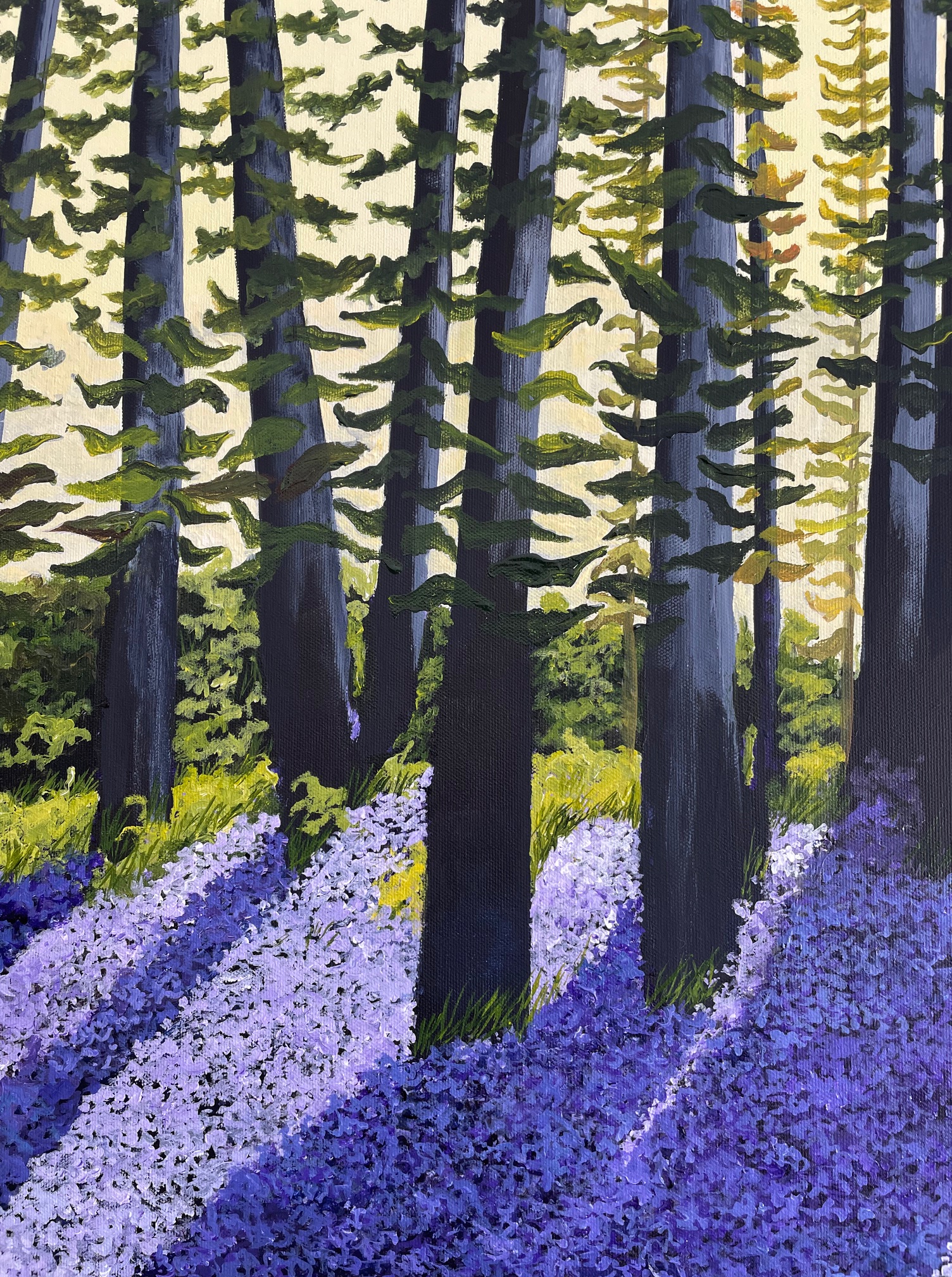 A lush carpet of purple wildflowers in a sun-lit forest is a scene that will turn any room into a happy, sunny place!