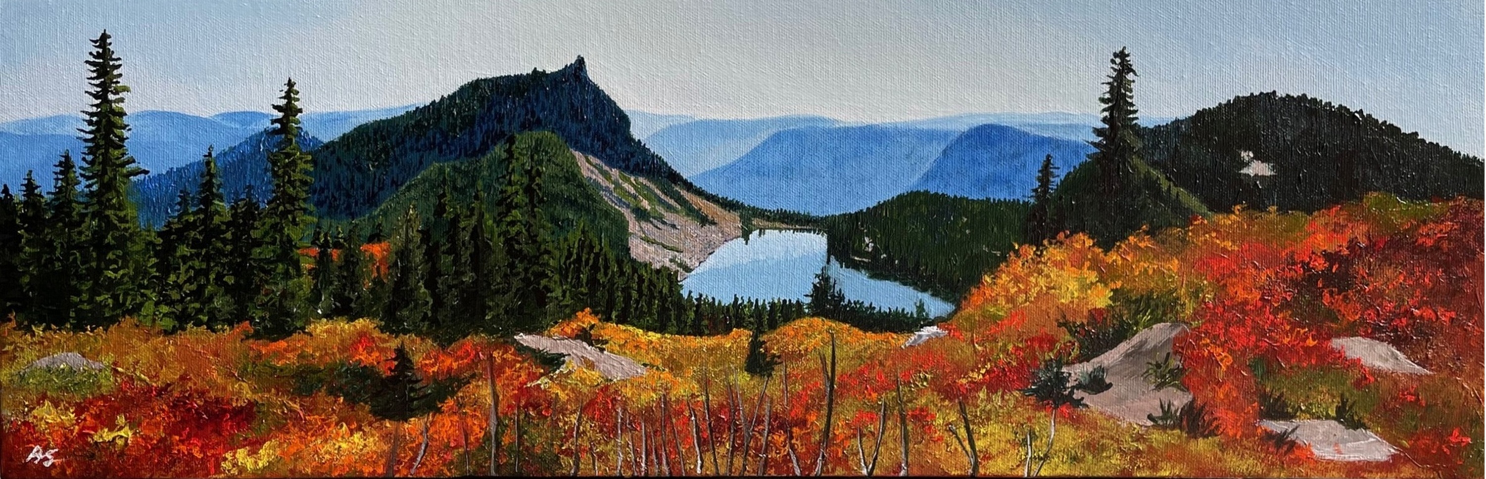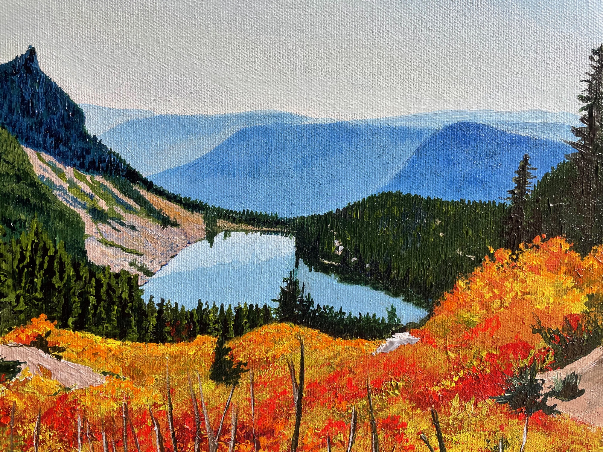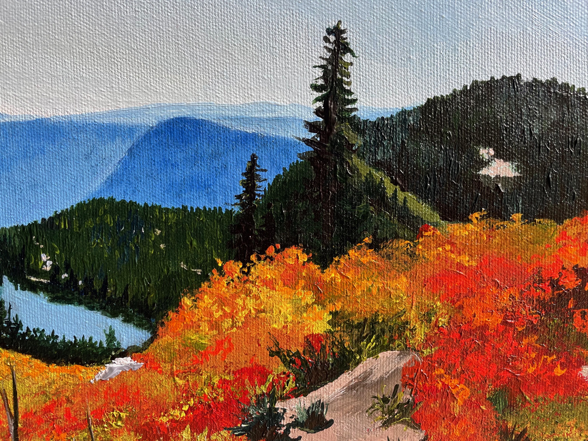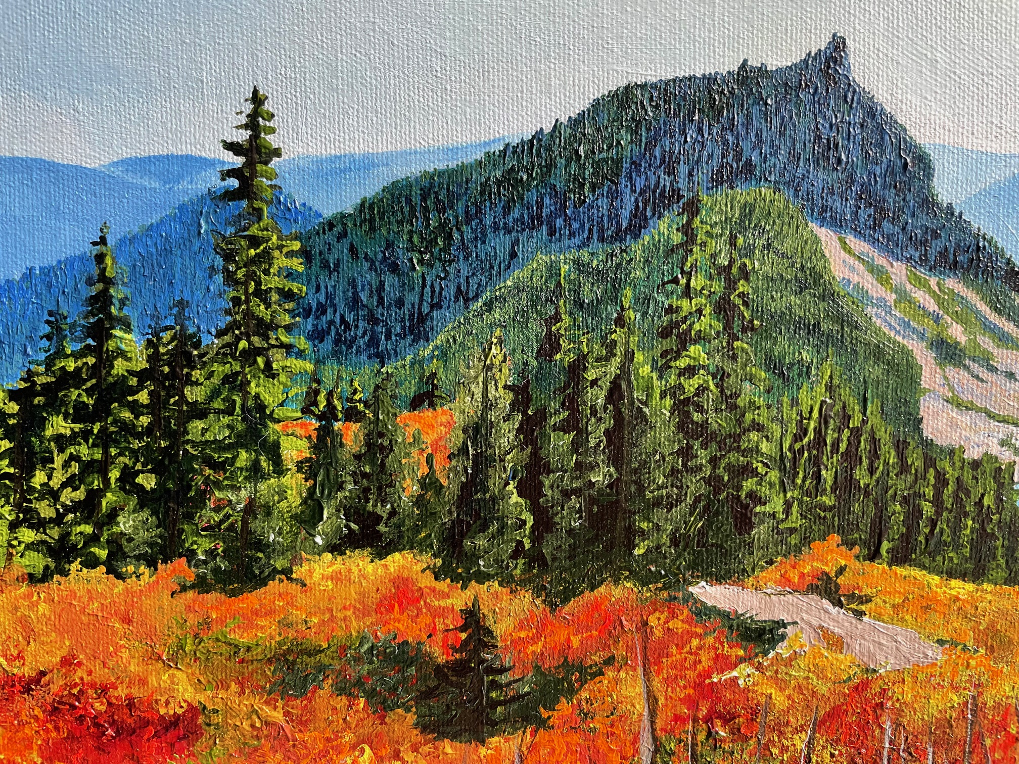 Scene continues around the sides. Matte varnish finish, and ready to hang! Painting measures 24″ x 8″ x 1.5″.
