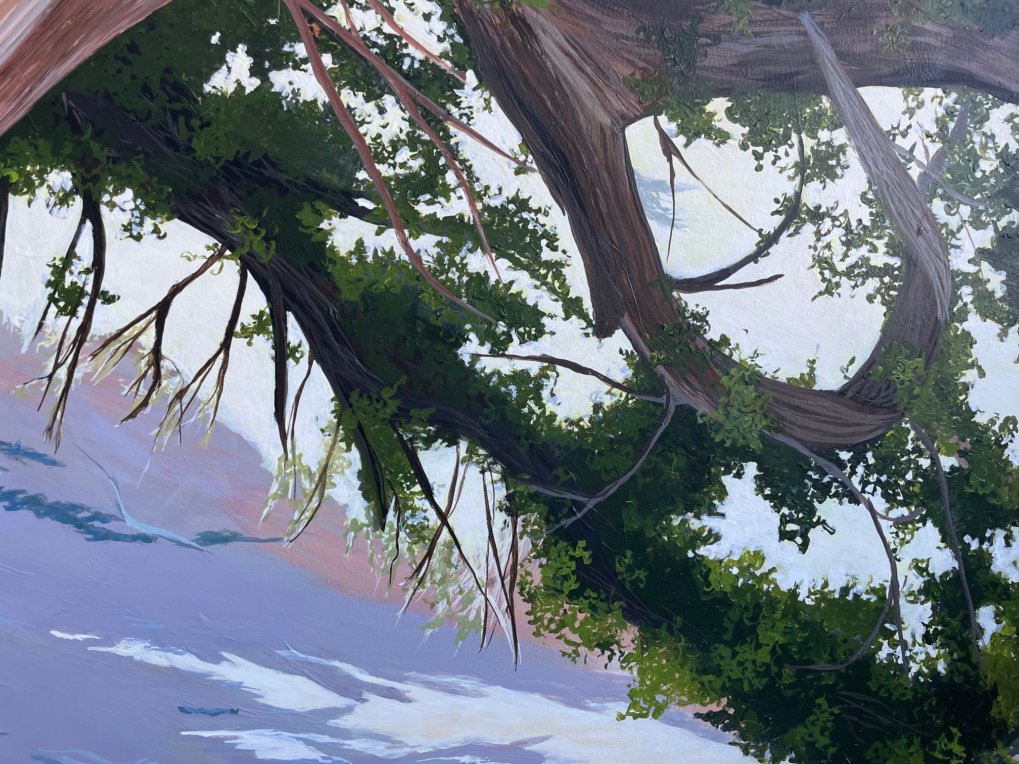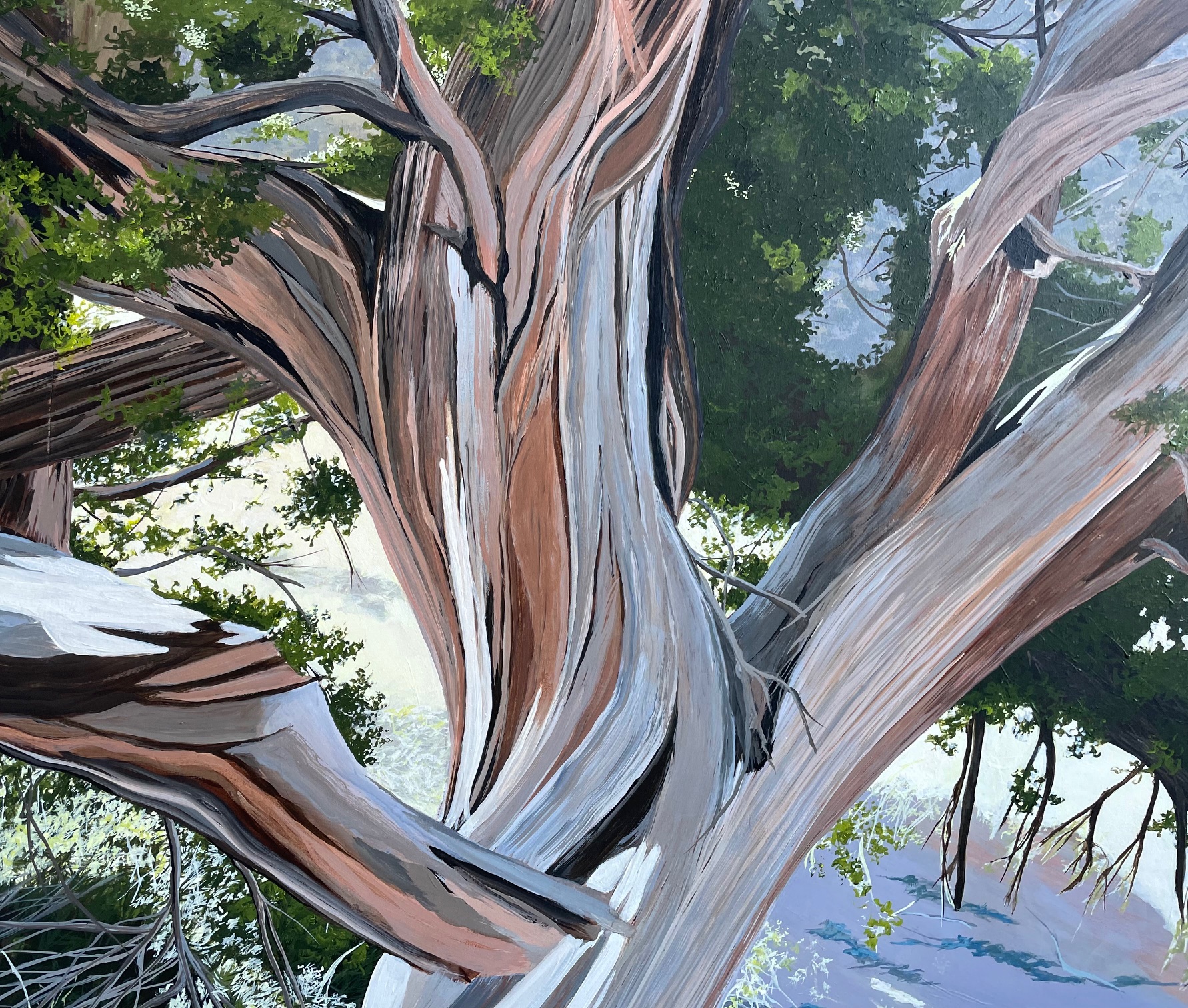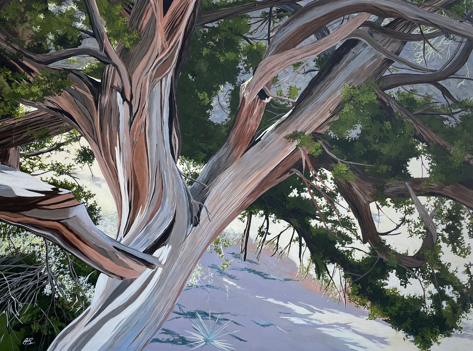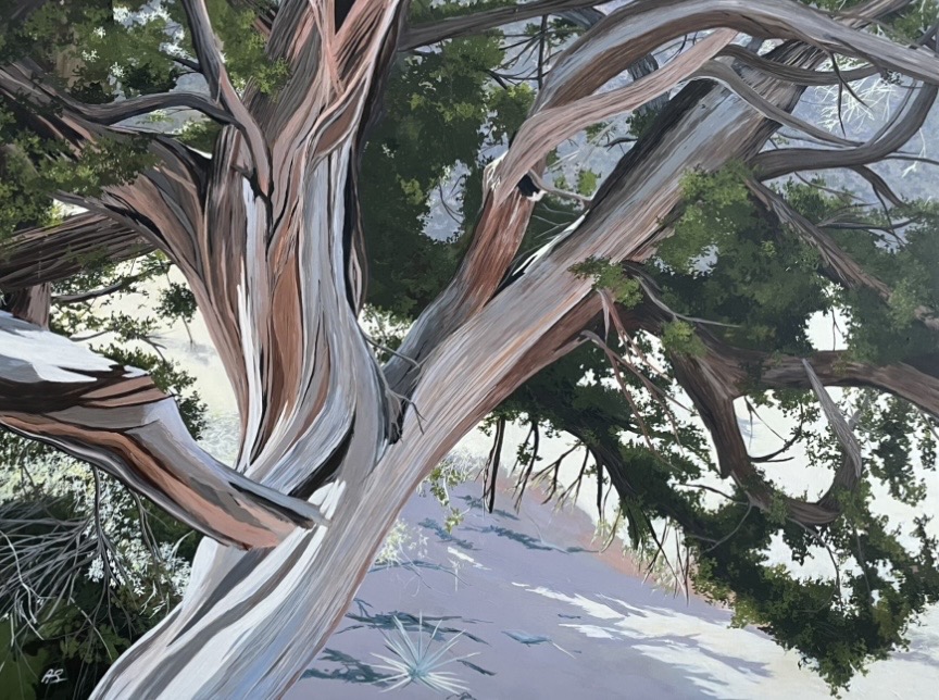 This painting captures the striking, time-carved form of a Utah Juniper, its twisted trunk and sweeping limbs shaped by decades of desert wind and sun. The intricate grain of the wood shifts between warm umbers and cool silvery tones, creating a sense of movement even in stillness. Soft light filters through dense, deep-green foliage, illuminating patches of ground below and giving the scene a quiet, contemplative atmosphere. The composition invites the viewer to feel the endurance and quiet beauty of this resilient tree—one that survives through extremes yet remains graceful and expressive.