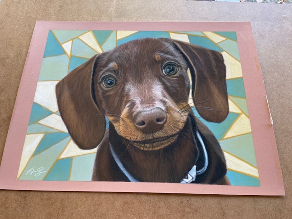 An inquisitive little dachshund drawn in soft pastel pencils on Pastelmat card.